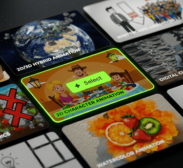 Dynamic Stock Footage Hand- Painted 2D/3D Hybrid Animation Papercraft Stop- Motion Infographic Motion Graphics 2D Character Animation Whiteboard Animation Digital Cutout Animation Fluid Morphing Animation Watercolor Ink Reveal Animation Doodle/Sketch Animation Simple Line- Art Animation Comic /Storyboard Style